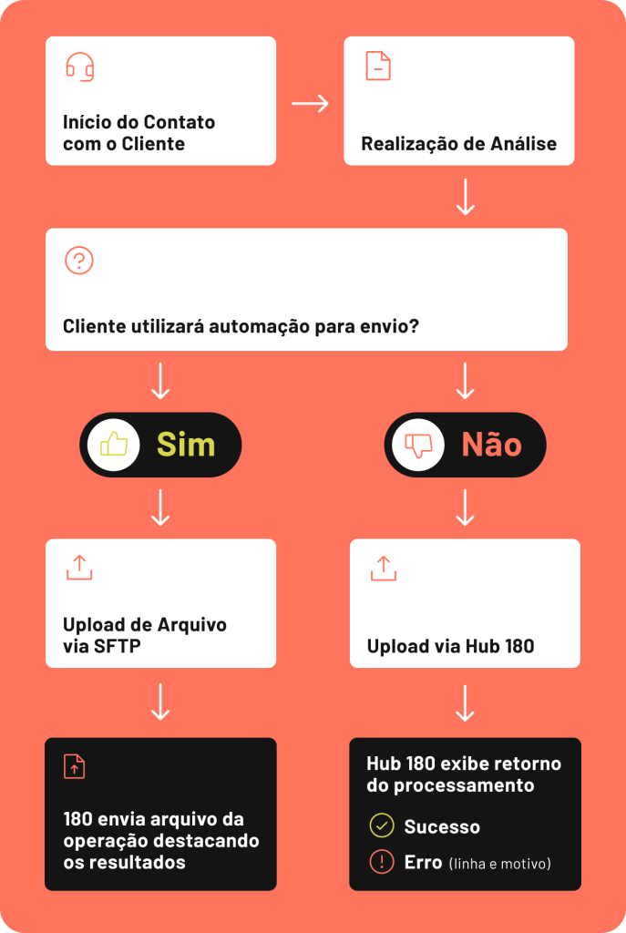 É um procedimento usado quando o cliente opta por automatizar o envio de informações. O SFTP (Secure File Transfer Protocol, Protocolo de Transferência Segura de Arquivos) garante que os arquivos sejam transmitidos de forma segura, criptografada e estável entre os sistemas do cliente e os da 180.