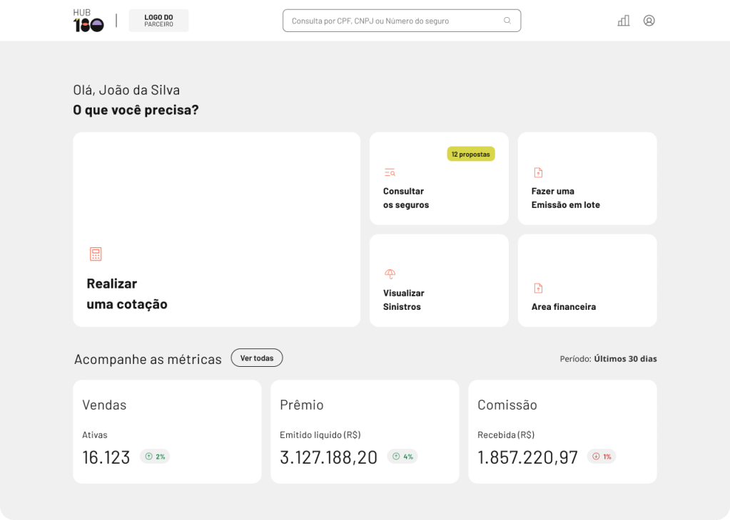 Na prática, o Hub 180 é dividido em dois pilares principais: centro de gestão e plataforma de vendas. Nosso centro de gestão tem as principais funcionalidades para o acompanhamento da sua operação de seguros: